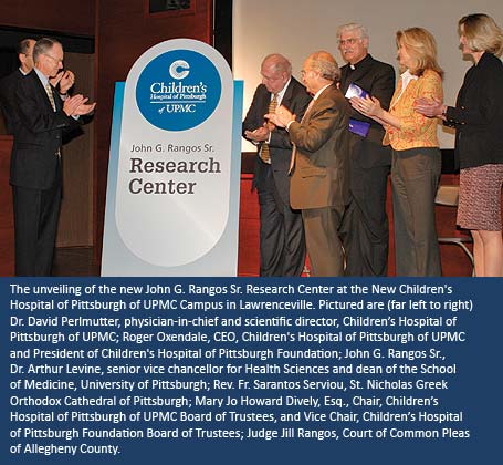 “Mr. Rangos is not only committed to pediatric health care, he truly understands the importance of research and how it can make an impact on pediatric care nationwide,” said Mary Jo Howard Dively, Esq., chair, Children’s Hospital of Pittsburgh of UPMC Board of Trustees, and vice chair, Children’s Hospital of Pittsburgh Foundation Board of Trustees. “The new facility is a real tribute to Mr. Rangos and his leadership. He is a person who understands how important research is to the organization, and he looks at how the contribution he plans to make can motivate researchers and foster overall growth.”