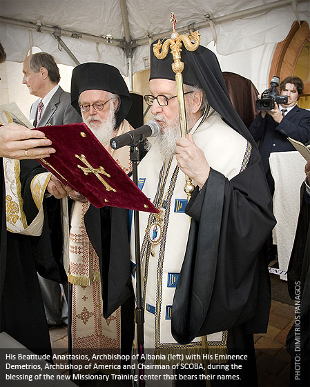 Two men, however, were recognized for their pivotal roles in the growth of the Orthodox Missions movement. His Beatitude Anastasios, Archbishop of Tirana, Durres and All Albania, and His Eminence Demetrios, Primate of the Greek Orthodox Archdiocese of America and Chairman of SCOBA, who were the honorees during the dedication. Addressing the two prelates, Board member Fr. Matthew Tate shared, “your missionary efforts throughout the Church truly are legendary, and it is most appropriate that the Mission Center building be dedicated in each of your names.”