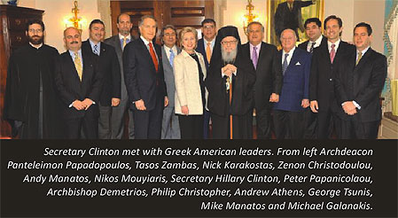 “On the closing day, conference participants visited and honored U.S. Secretary of State Hillary Clinton at the State Department. Led by his Eminence Archbishop Demetrios the delegation included Philip Christopher, Andrew A. Athens, Andy Manatos, Peter Papanicolaou, Nikos Mouyiaris, George J. Tsunis, Mike Manatos, Tasos D. Zambas, Zenon Christodoulou and Michael Galanakis.