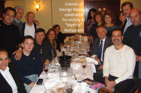 A few days after his breathtaking victory, an exuberant George Maragos and his wife Angela, were the honoured guests at an impromptu dinner at Bayside’s “Mythos” Restaurant, hosted by his Lefkadian compatriots and friends with origins from other areas of Greece as well. Ready to assume his new position, Maragos encouraged other young people to seek elected positions because “in elections nothing is impossible.” He then recalled that when he announced his candidacy, nobody would give him a chance of winning. However, “I worked very hard and expected a good outcome,” he said. “I look forward to the opportunity of serving the community.”