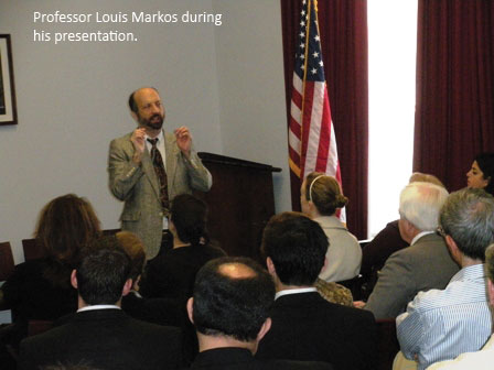 Dr. Markos’ presentation is part of the “Contemporary World through Classic Eyes Lecture Series” co-sponsored by the National Hellenic Society, The Congressional Hellenic Caucus, The American Hellenic Institute Foundation and Odyssey Magazine. The Lecture Series provides a refreshing perspective of the old world within the context of contemporary issues and challenges. Dr. Markos addressed several Congressional members of the Hellenic Caucus, staff and dignitaries that included Cyprus Ambassador Andreas Kakouris, Greece’s Defense Attaché Colonel Taxiarchis Sardellis, Greece’s Press Attaché, Magda Hatzopoulos, American Hellenic Institute Executive Director, Nick Larigakis, public policy and government representatives and members of the public.