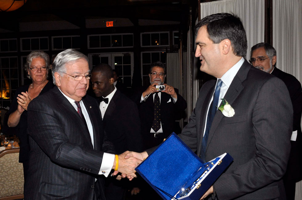 On the eve of the Archangel Michael’s Greek Orthodox Church, of Port Washington, NY, benefit concert, starring Greek artist George Dalaras, at the Lincoln Center for the Performing Arts, a lavish dinner reception was offered at the Central Park’s Boathouse restaurant (owned by parish member Dean Poll) honoring Archbishop Demetrios, Leonard & Penelope Zangas, Mike & Libby Angeliades, Peter & Kathy Mesologites, Perry & Georgia Alexiou and Katherine L. Peters (posthumously) with the Hellenic Thread Award “in recognition of their commitment and support in strengthening and perpetuating the threads of our Greek Orhtodox Faith and Hellenic ideals through words, actions and deeds,” as Protopresbyter Dennis Strouzas, along with Presbyter Evan Evangelidis stated.