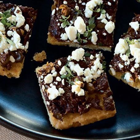- 6. Spread the olive mixture evenly on the phyllo dough, leaving a ½ inch border. Top with the onions, dollops of the ricotta or feta cheese, and the remaining 1/4 cup olives.