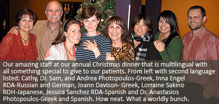 The first one in his family to become a Doctor and join the dental field, Dr. Sam had no idea what kind of trend he had started. In 2007 his practice was introduced to Dr. Photopoulos number two, Anastasios, an honors graduate from University of the Pacific in San Francisco, aka my one and only “favorite” big brother. Father and son working op by op, changing the lives of individuals for the better. Then in August of 2008 another family addition to the practice, Miss Andrea Photopoulos, a Dental Hygienist, yes that's me. A father's dream come true, our motto “Let our family take care of your family”. Not only his children, but Dr. Sam also has had his sister, Joann, working the front desk as office manager for over 25 years and his wife, Cathy, a formal dental assistant and the office's interior decorator, in and out, always putting in a helping hand. “Our Big Fat Greek Dental Office Family.”