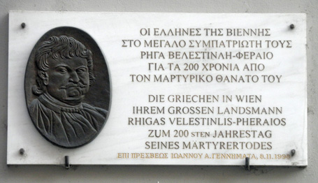 By the time of Greek independence in the 1820s, the Vienna community was at its acme, with about 5,000 members and an increasingly diverse socio-economic structure. The articulate and prosperous community naturally agitated for Greece’s liberation from the Ottoman yoke, but at the same time they were conscious that the Austrian Empire, a bundle of nationalities under a relatively benign but nonetheless absolute autocracy, was violently opposed to, and fearful of, revolution. Austrian Greeks therefore had to walk a very thin line between joy at Greece’s prospective independence and their personal safety and livelihood in the Austrian Empire. After all, the Austrians arrested Rhegas Pheraios and handed him over to the Turks, who strangled him in Belgrade in 1798. In Belgrade, the Serbs honor him with a statue and a street bearing his name, as he agitated for a pan-Balkan federation.
